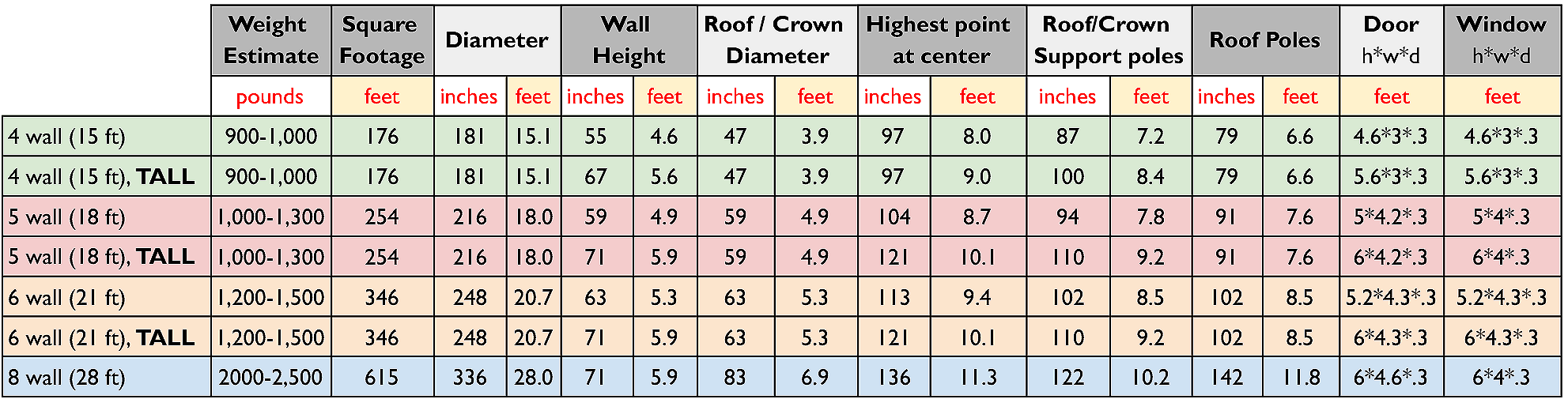 Tall Walls – For an extra charge, you can increase the height of the walls. The tall and regular wall heights are slightly different depending on the size of the yurt. Below is a table indicating the measurements based on yurt size.