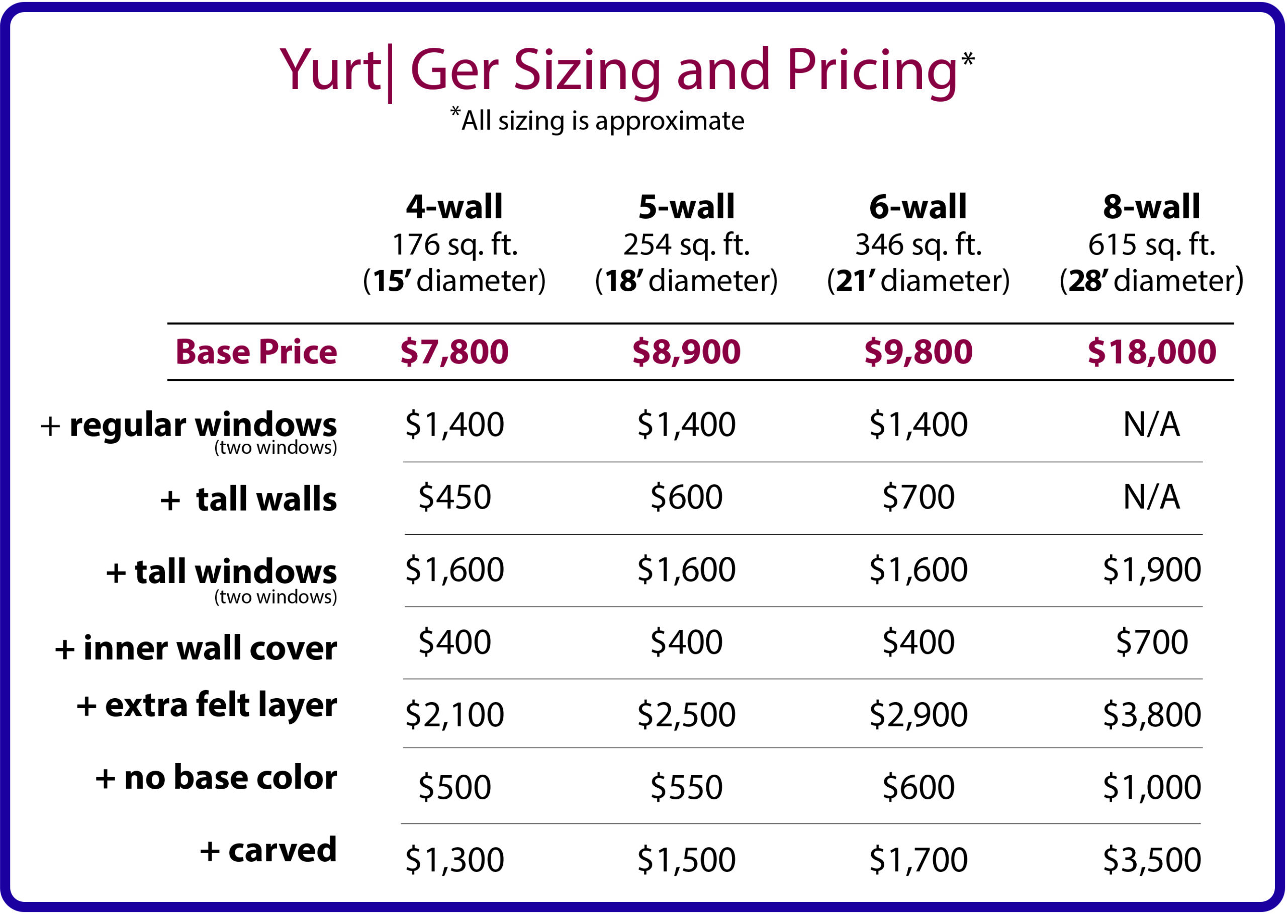 Please find a pricing chart below. For your convenience, you can also build your yurt in our shopping cart. Start by selecting your size.